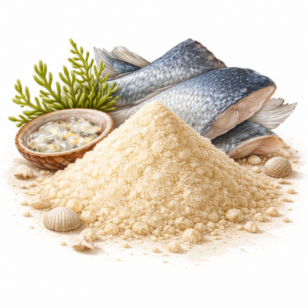Origine : sous-produits de poissons marins ou d’aquaculture, transformés par extraction puis hydrolyse partielle