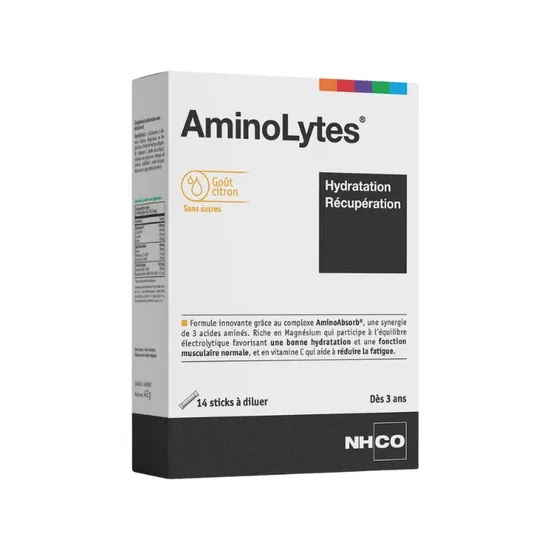 AminoLytes est une poudre en sticks à diluer associant 3 acides aminés, sodium, potassium, chlorure, magnésium et vitamine C, sans sucres.