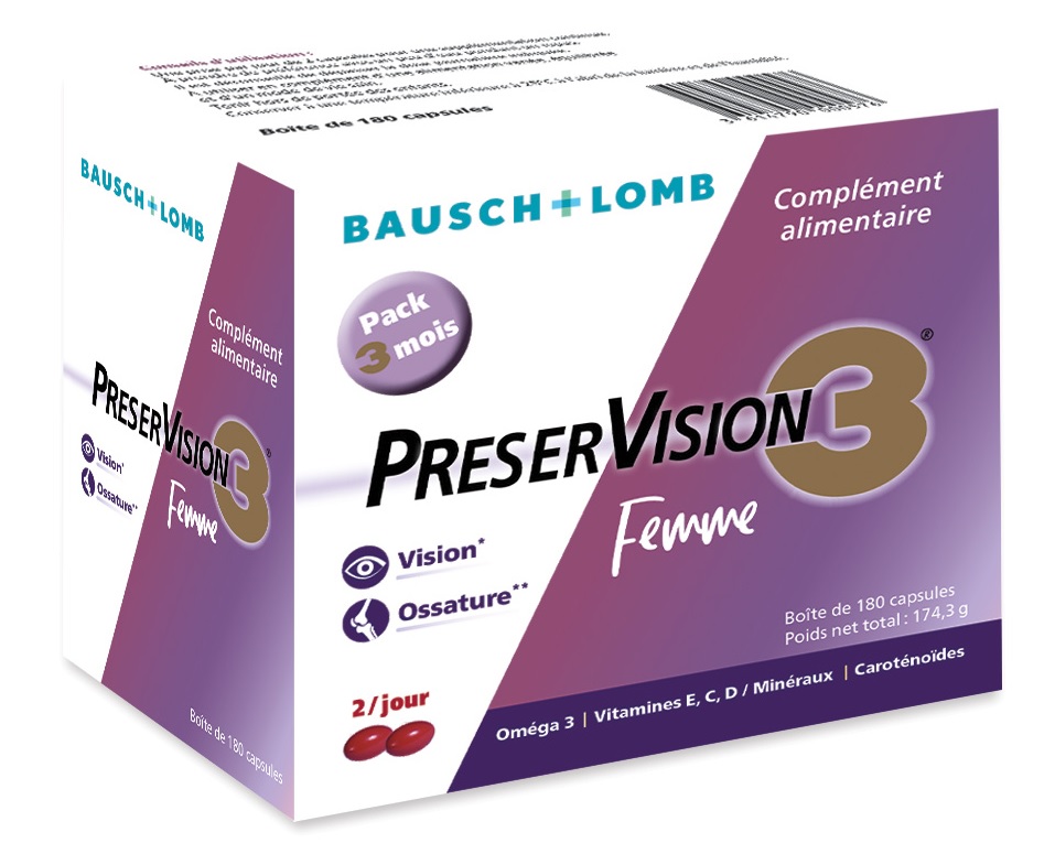 PreserVision 3 Femme est présenté par Bausch + Lomb comme une formule oculaire spécifiquement adaptée aux besoins des femmes.